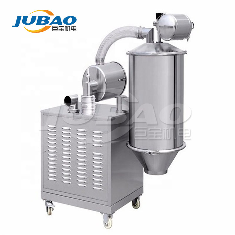 真空上料机是用真空泵抽气,使吸料嘴进口处及整个系统处一定的真空状态,粉粒料随同外界空气被吸入料嘴,形成料气流,经过吸料管到达料斗,在料斗中进行气、料分离。分离后的物料进入受料设备。输送、放料是通过气动三通阀不断地开、闭来完成的,而气动三通阀的开闭是由控制中心来控制的。