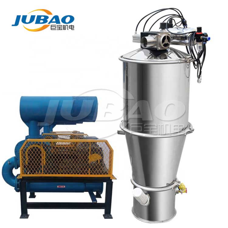 真空上料机是用罗茨风机抽气,使吸料嘴进口处及整个系统处于一定的负压状态,粉粒料随同外界空气被吸入料嘴,形成料气流,经过吸料管到达料斗,在料斗中进行气、料分离。分离后的物料进入受料设备。送料——放料是通过气动换向阀不断地开、闭来完成的,而气动换向阀的开闭是由控制中心来控制的。真空上料机中装有压缩空气反吹装置,每次放料时,压缩空气脉冲反吹过滤器,把吸附于过滤器表面的粉末打落下来,以保证吸料能正常运行。对料位控制的真空加料机,受料设备的料斗中物料通过料位计完成自动加料。当受料设备的料斗高于某一位置时,真空加料机停止动作进入待机状态;当料位低于某一位置时,真空加料机自动启动,完成对受料设备的加料。