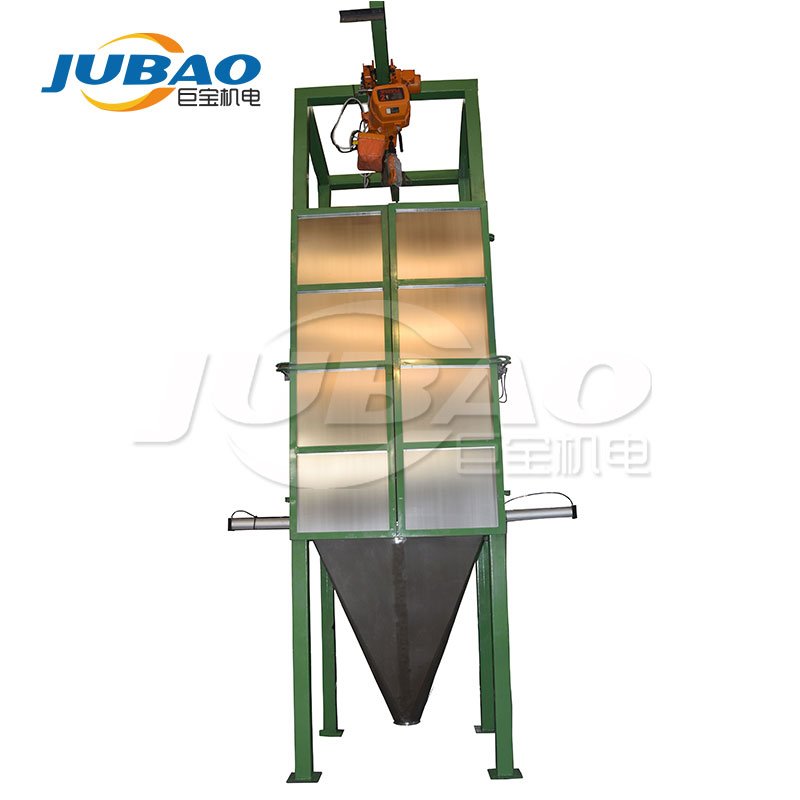 拆包机自身配置电动葫芦将物料吊装到拆包机的机架上方,然后缓缓下落,物料袋在缓慢下落过程中由人工拆开下料口或者由十字割刀(选配)将物料袋底部划开,物料靠重力滑落,使吨袋内的粉粒状物料靠重力落进贮斗中来完成卸料工作。该装置能有效保护生产环境,减轻劳动者的工作强度,同时还提G生产效率,解决了大袋在开袋工作中因吸潮导致结块、搭桥不易出料的现象。