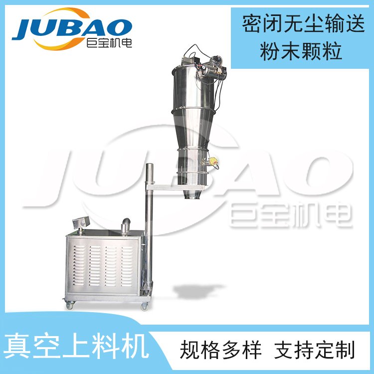 真空上料机是由真空泵(无油、无水),真空料斗,过滤器(有聚酯覆膜过滤器、pe过滤器、316L不锈钢过滤器或钦金属过滤器多种选择),压缩空气反吹装置,气动放料门装置,料位自动控制装置,不锈钢吸料咀,输送软管等组成,整套系统设计合理。